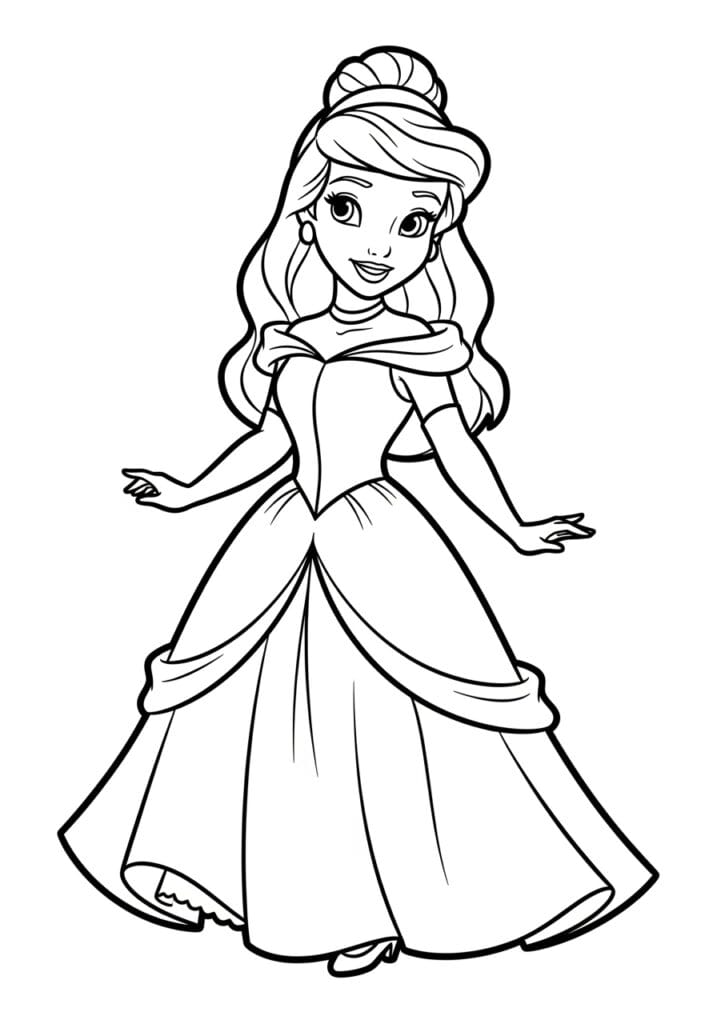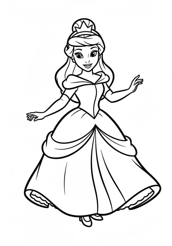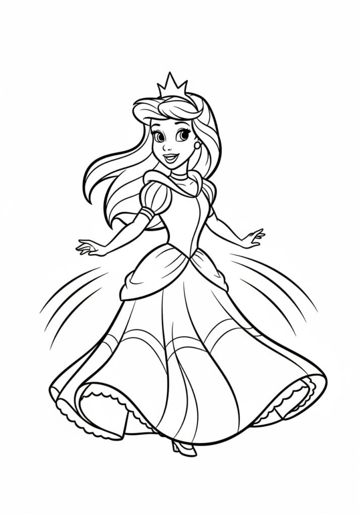 This gorgeous coloring page features a princess in a full, flowing ballgown that sweeps dramatically across the bottom of the page. The dress has beautiful layered skirts with gentle draping folds and a fitted bodice, giving it that classic fairy tale silhouette we all adore. The line work is clean and confident with smooth, medium-weight outlines that make every section easy to distinguish. Her hair is swept up elegantly with soft waves cascading down, and her pose is playful and mid-twirl, arms gently extended as if she’s dancing at the royal ball.