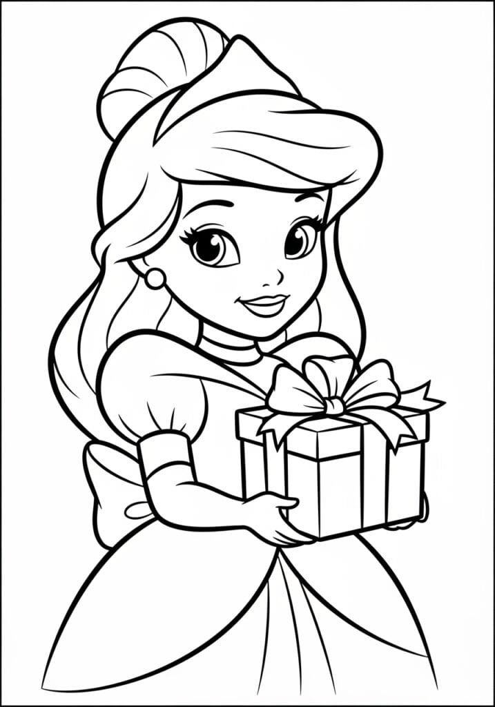 This coloring page is just bursting with gift-giving joy and would be absolutely perfect for birthdays, Christmas, or any special occasion! The design is a close-up portrait-style composition that really draws you into the princess’s adorable face, with her big sparkly eyes and the most excited expression as she holds out a beautifully wrapped present with both hands. The gift box is square with crisp ribbon lines running across it and a big fluffy layered bow on top with lovely petal-shaped loops. She’s wearing an off-shoulder gown with cute puffed sleeves, and her long wavy hair frames her face beautifully with a neat updo bun on top. The line work is bold and chunky with thick confident outlines that give the whole design a really charming and polished cartoon quality.
