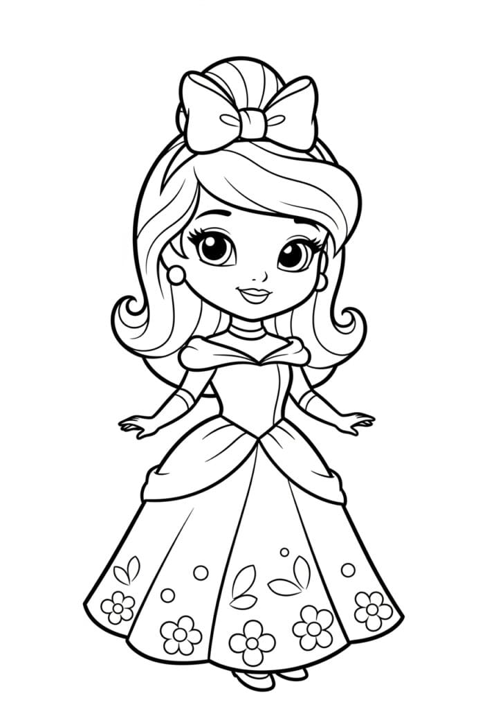 Cute Chibi Princess with a Bow and Floral Dress Coloring Page