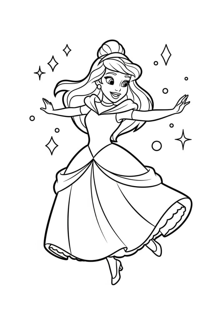Princess Dancing and Leaping Through a Shower of Magic Sparks Coloring Page