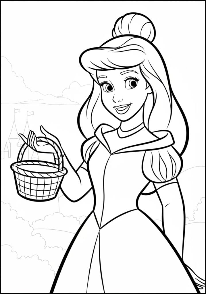 Princess Carrying a Wicker Basket with a Castle in the Background Coloring Page