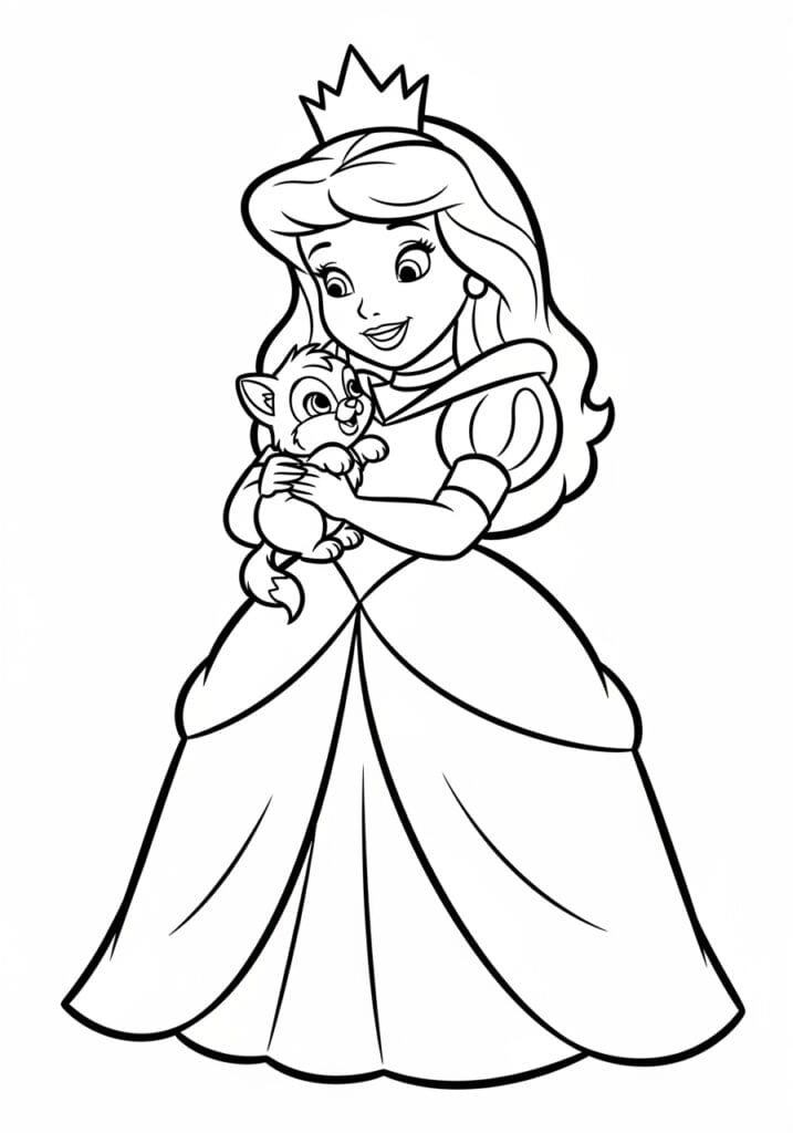 Princess Cuddling an Adorable Baby Kitten Coloring Page