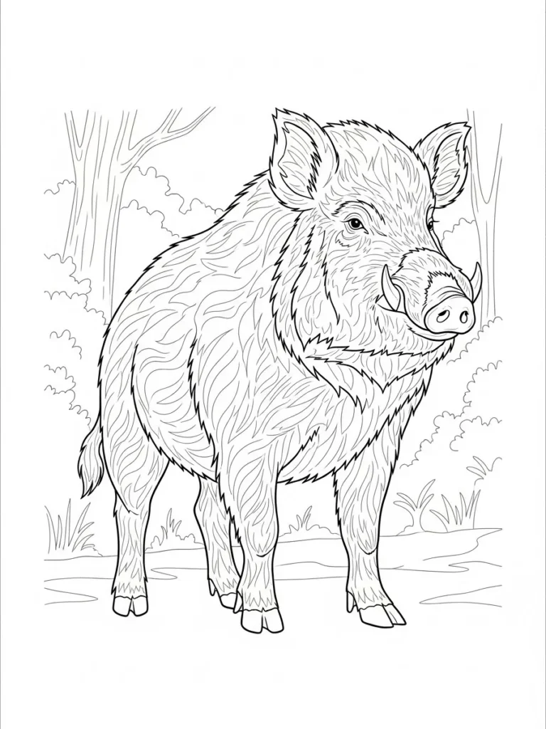 This adult coloring page features a strong and slightly rugged wild boar standing confidently in a quiet forest clearing. The design uses fine detailed linework to show layered fur textures across the body, from the bristly back to the softer curves around the legs and face. The tusks are bold but balanced, adding character without overpowering the scene. Trees and gentle foliage frame the boar in the background, while the open white space keeps the layout airy and easy on the eyes. The line thickness varies just enough to guide the eye and make each section satisfying to color.