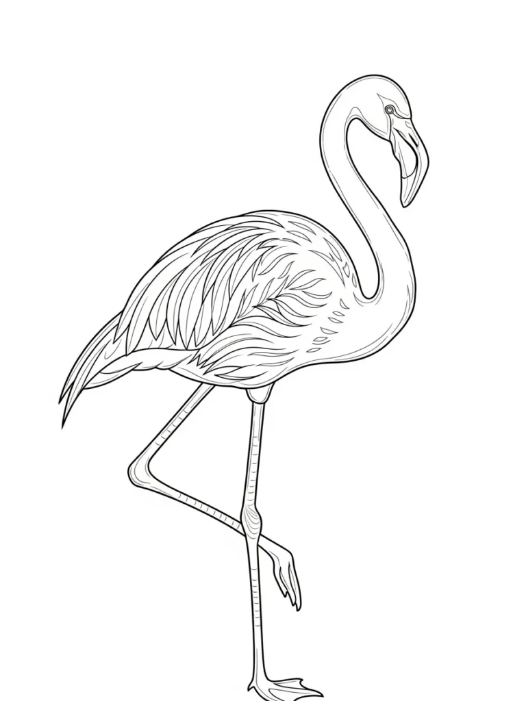 This adult coloring page features a graceful flamingo standing on one leg, with long flowing lines that highlight its elegant posture. The feathers are drawn with soft layered strokes that add texture without overcrowding the design, giving the whole page a light and airy feel. Clean linework defines the slim legs, curved neck, and gently shaped wings, while the open background keeps the focus on the flamingo’s beautiful silhouette. The overall layout feels calm, balanced, and very satisfying to color.