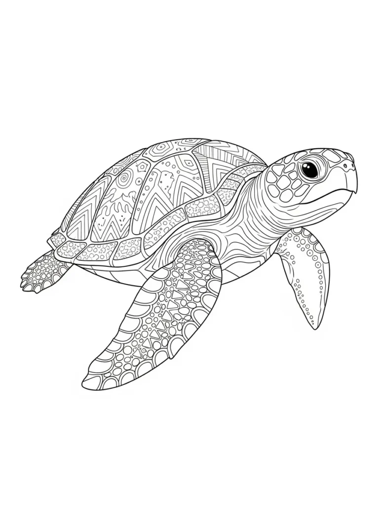 This coloring page showcases a beautiful sea turtle gracefully gliding through the water, captured in lovely black and white line art. The overall image is quite detailed, especially the majestic shell which is filled with a captivating variety of geometric and swirling zentangle-like patterns within each scute. You can see flowing lines creating texture on the neck and flippers contrasting with the sharp details on the carapace. The line work is consistent and clear throughout making it perfect for precise coloring.