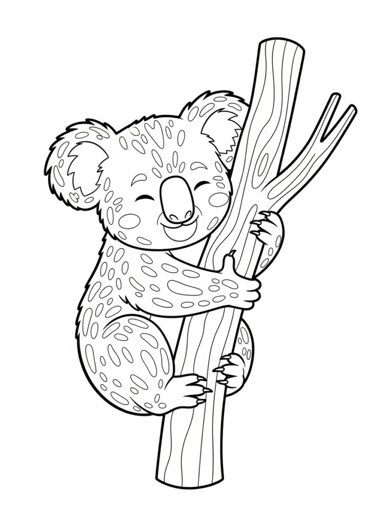 This coloring page features the cutest little cartoon koala you ever did see, looking utterly content as it gives a big, loving hug to a tall eucalyptus branch. The design uses bold, clear outer lines for the shape of the koala and the tree, which is perfect for easy staying-in-the-lines coloring. Instead of realistic fur texture, the koala’s body is filled with charming, simple oval and circular shapes representing patches of fur or maybe even some fun spots. The tree trunk itself has vertical lines to suggest bark texture without being too overwhelming.