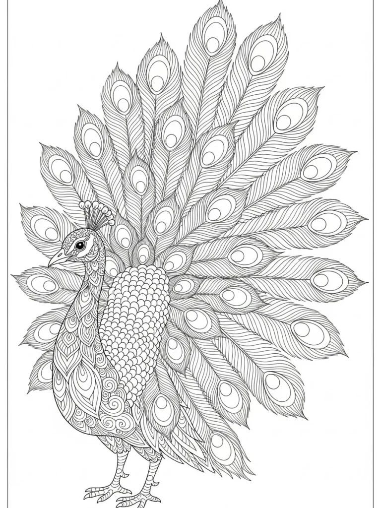 Coloring this magnificent bird is going to be an absolute treat for anyone who loves rich, vibrant color combinations. I can already envision carefully filling in the body patterns with deep jewel tones like sapphire blue and emerald green, and then making those gorgeous tail eyes really shimmer with golds and iridescent purples. It’s an engaging challenge because there are so many little sections to fill but the repetitive nature of the feather eyes is surprisingly meditative. This page offers a wonderful sense of accomplishment when you see all that glorious color come to life.