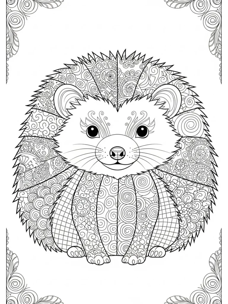 This design features the sweetest little hedgehog facing forward with the happiest little smile, ready for a coloring adventure. Its body and quills are completely covered in a mix of intricate patterns typical of zentangle art like tight swirls paisley motifs and sections with cross-hatching. The overall layout is very centered and compact making the hedgehog feel cuddly despite its spikes. There are also delicate scrolled corner decorations framing the whole picture adding an extra touch of elegance.