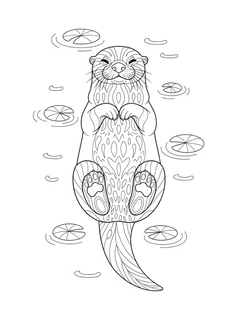This adult coloring page shows an adorable otter floating peacefully on its back, surrounded by gentle ripples and scattered lily pads. The otter’s body is filled with soft decorative patterns that add visual interest without feeling too busy, making it perfect for slow and mindful coloring. The linework is clean and smooth with medium thickness, giving the design a polished look while still leaving plenty of space for shading and color blending. The simple water elements keep the focus on the otter, and the overall layout feels balanced and calm from top to bottom.