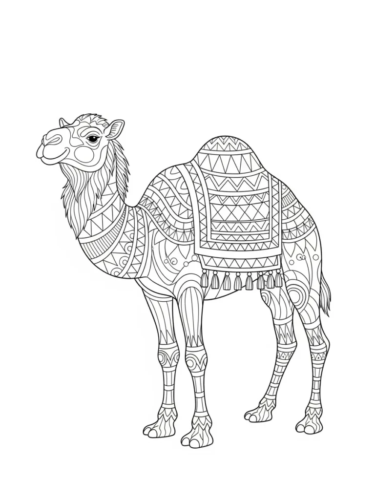 This adult coloring page features a graceful camel standing tall, covered in beautifully detailed geometric and ornamental patterns from head to hoof. The design mixes repeating shapes, stripes, and layered motifs that flow naturally along the camel’s body, creating a rich and balanced look. The saddle blanket adds extra texture with tassels and bold pattern sections, while the clean background keeps the focus on the intricate line art. Line thickness is consistent and smooth, making each section clear and satisfying to color without feeling crowded.