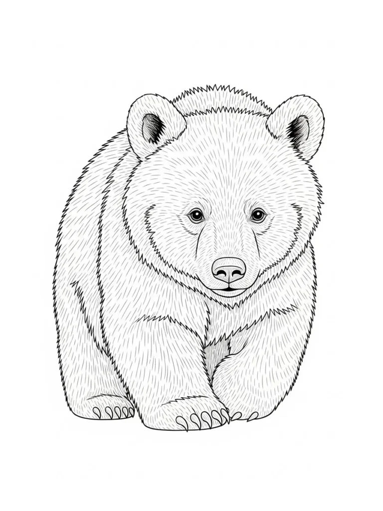 This adult coloring page features a sweet yet majestic bear sitting calmly and facing forward, with beautifully layered fur lines that give the design depth and texture. The linework is fine and consistent, creating a fluffy look without feeling cluttered. Subtle details in the face and paws add personality, while the simple background keeps all the attention on the bear itself. The overall layout feels balanced and cozy, making it easy to focus on shading and color transitions across the fur.