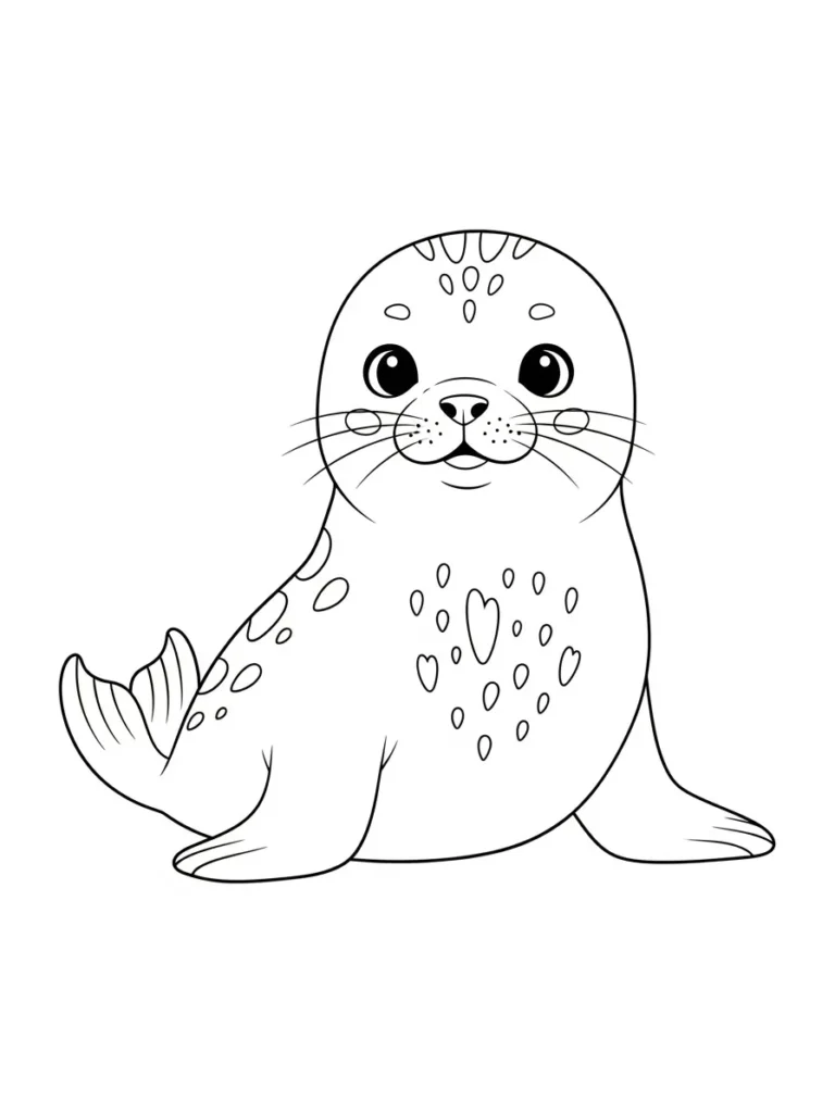 This coloring page features the most irresistibly cute baby seal or pup just chilling and looking right at you with big innocent eyes. The design is wonderfully simple with thick clean outlines perfect for coloring without frustration. The main decoration comes from the sparse spots scattered over its smooth body and head which include a few adorable little hearts mixed in with the circles. The tail flippers and the little head markings provide simple areas to play with lighter colors or shading.