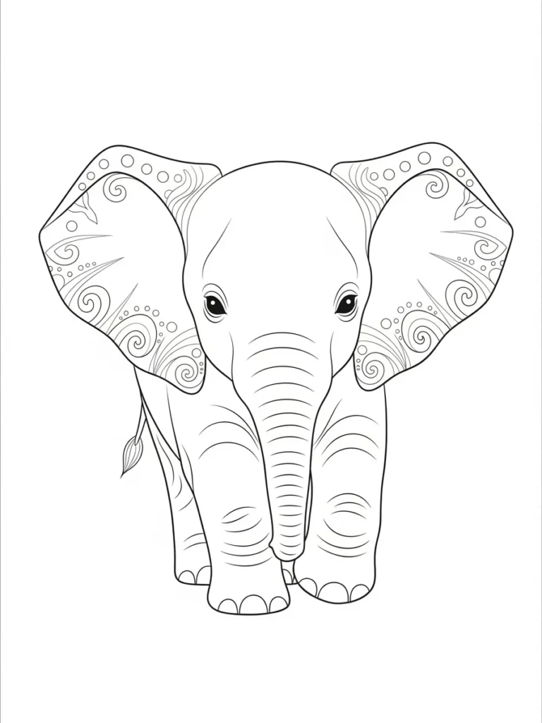 This adult coloring page features a sweet baby elephant standing front and center, with oversized ears filled with soft swirling patterns that add a playful touch. The body is kept mostly open with gentle contour lines, while the ears bring in just enough detail to make the design interesting without feeling busy. Clean, smooth linework gives the elephant a friendly and approachable look, and the simple background leaves plenty of room to focus on coloring and shading. The overall layout feels balanced and calm, making it easy to enjoy every section.