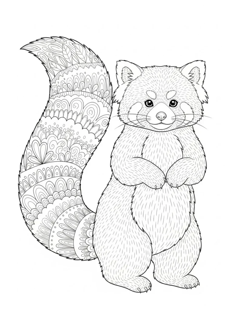 This adult coloring page features an irresistibly cute red panda standing upright, with soft fur details across its body and an extra detailed, fluffy tail filled with layered patterns. The face is simple and expressive, while the tail steals the spotlight with repeating curves, petals, and decorative sections that feel playful yet polished. Line thickness stays clean and even throughout, making it easy to color both the smooth fur areas and the more intricate tail designs. The open background keeps the layout light and uncluttered, which really lets the character shine.