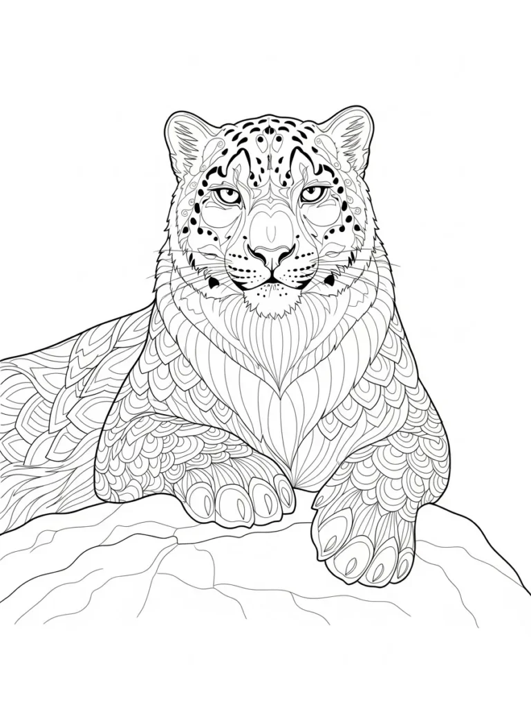 This adult coloring page features a powerful leopard resting calmly on a rock, with its body covered in flowing decorative patterns that echo natural fur markings. The face is detailed and expressive, framed by subtle spots and gentle contour lines that give it a strong yet serene presence. Across the body, layered shapes and repeating motifs add richness without overwhelming the design. The linework is smooth and consistent, creating clear sections that feel satisfying to color while keeping the overall layout balanced and grounded.
