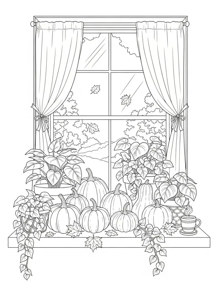 This adorable coloring page captures the perfect cozy autumn scene, giving you all the fall vibes right on your windowsill. The central motif is a large window framed by gathered curtains tied with pretty bows at the sides. Looking out into the view you can see a gently hilly landscape covered in trees and a few signature maple leaves drifting down, really setting that perfect autumn mood. The wide windowsill is absolutely overflowing with a delightful harvest arrangement that feels just right for the season. We have a variety of pumpkins and gourds in different shapes and sizes clustered together, along with several lovely potted plants, including some beautiful trailing vines that spill down the front for an extra touch of life. Plus, there is a tiny steaming mug on a coaster tucked in among the greenery and pumpkins, just waiting for a warm drink break. The line work is clean and consistent, offering lots of fun details to color within this charming, slightly cluttered design.