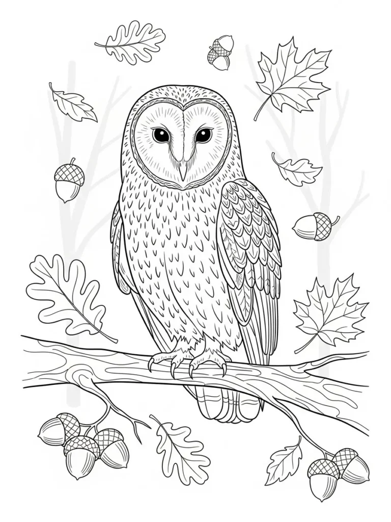 This coloring page features a stunning portrait of a barn owl perched gracefully on a sturdy tree branch, giving us a wonderful wildlife moment for our autumn collection. The owl itself is the main subject, showcasing beautifully detailed feather patterns on its chest and wings, highlighted by its iconic heart-shaped facial disc and striking eyes. Surrounding the wise bird are classic fall elements like crisp oak leaves, some single floating leaves, and clusters of acorns hanging from smaller twigs. In the background, faint, bare tree silhouettes suggest a cool, perhaps late-autumn day or early morning. The line work is generally strong, with fine detailing reserved for the owl’s plumage and the texture on the acorns.