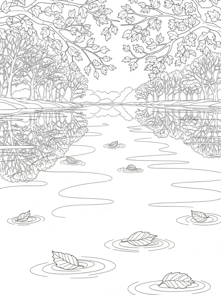 This coloring page captures a wonderfully serene landscape scene that perfectly embodies the quiet beauty of autumn. The layout draws your eye inward down a central body of still water, perhaps a lake or slow-moving river, framed by dense lines of trees on both banks. Overhanging branches with detailed leaves arch into the top of the frame, adding natural structure. The most captivating element is the water itself, which features clear reflections of the trees and the sky, interrupted only by gentle ripples marking the spots where several fallen leaves have settled. The line work is delicate, especially in the reflections and the fine edges of the canopy, creating a very calm and detailed image.