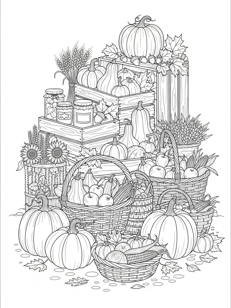 This coloring page is an absolute feast for the eyes, showcasing an overflowing abundance of delicious fall goods stacked high like a grand market display. The composition is tall and impressive, featuring several wooden crates stacked to create different levels for the bounty. We see a wonderful variety of pumpkins and gourds, multiple woven baskets brimming with apples, corn on the cob, and perhaps some onions, as well as sheaves of wheat and two jars of preserves nestled on the top crate. Scattered among the harvest are beautiful sunflowers and plenty of detailed maple leaves. The line work is clean and precise, particularly excellent for capturing the tight weave of the many baskets and the ribbed texture of the squash.