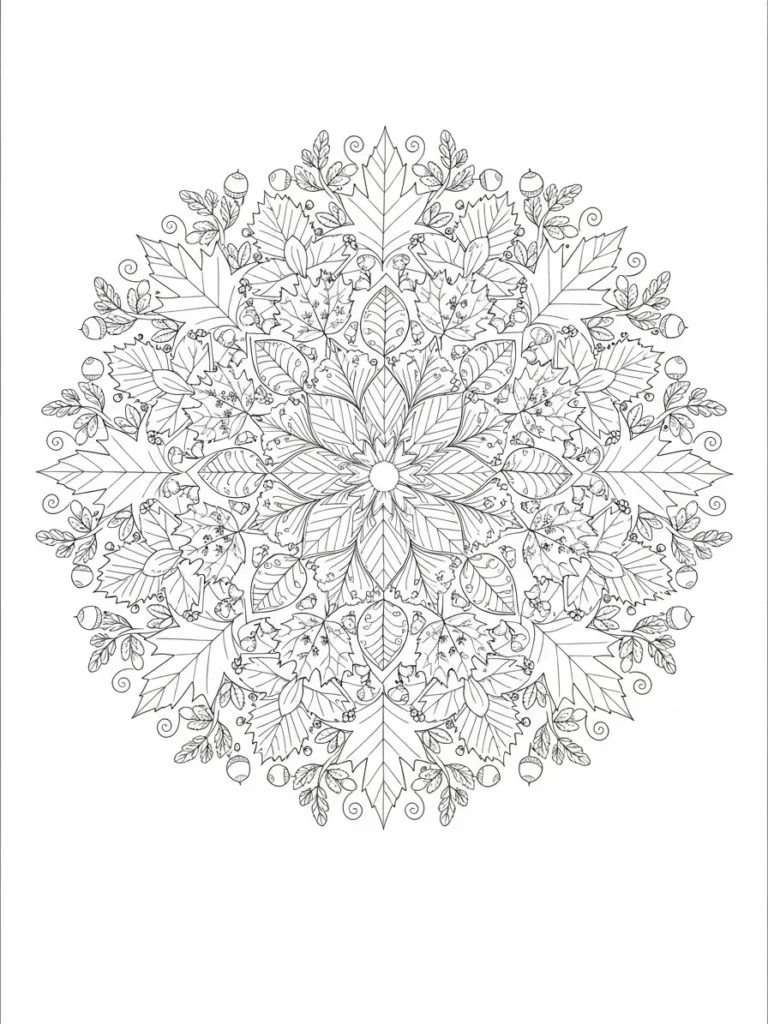 If you’re into intricate designs, this mandala is going to give your coloring skills a fantastic workout, which I find incredibly satisfying. I love that I can use all the rich, beautiful colors associated with the season—deep burgundies, fiery reds, warm golds, and earthy greens—to make this pop. Focusing on shading the individual leaves in repeating patterns around the circle is a perfect way to achieve that deeply mindful, almost meditative coloring experience. It is engaging because you have to decide on a color scheme for each wedge, and the symmetry ensures that whatever you choose, the final result will look perfectly balanced and incredibly professional.