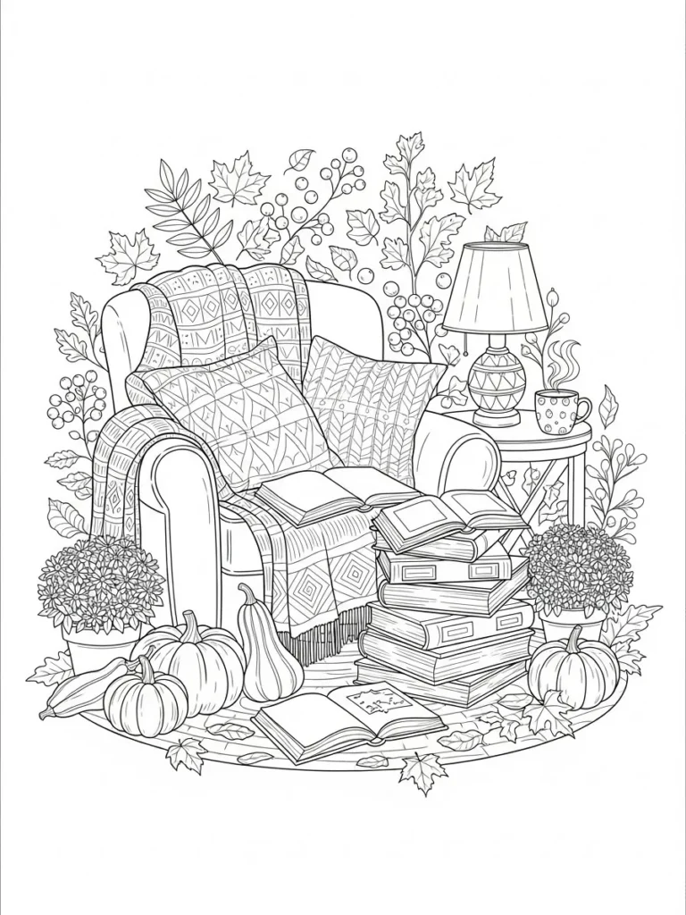 This coloring page is the epitome of autumn hygge, surrounding a comfy armchair with all the best seasonal decorations and activities. The main element is a plush chair draped with a patterned throw blanket and piled with pillows featuring intricate geometric designs. Stacked next to the chair is an inviting tower of books, with a few open to show pages ready for coloring. The floor space is dedicated to a lovely harvest display of pumpkins, gourds, and a pot overflowing with mums, all set against a background filled with swirling branches, leaves, and berries. Even a small side table holds a lamp and a steaming mug to complete this cozy tableau. The line work is wonderfully detailed, especially in the sweater patterns and the texture of the book pages.