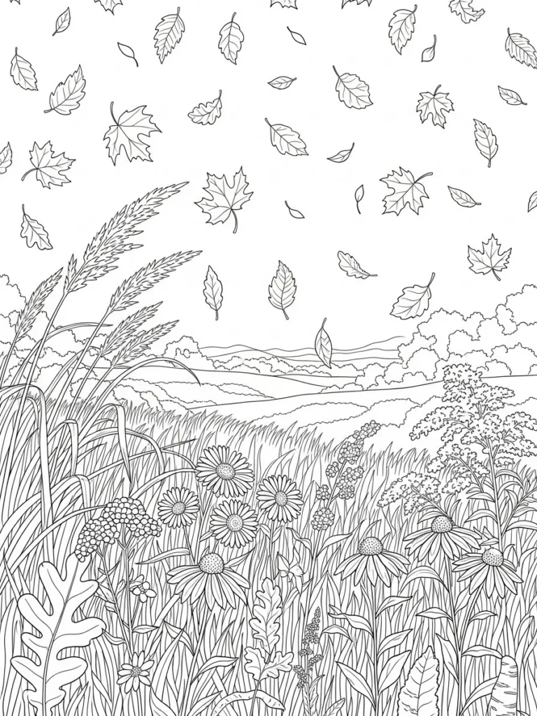 I find this page incredibly engaging because it lets me play with color in a very natural, expansive way, focusing on the late-season palette. I absolutely love coloring nature scenes like this where the colors aren’t always perfectly uniform. I can use a variety of yellows, pale oranges, and muted greens for the grasses and flowers, mimicking how late-season growth looks. Then, using rich, varied reds and browns for all those falling leaves will add so much life and movement to the upper half of the page. Coloring all the individual blades of grass is super calming for me, and it makes the whole scene feel fresh and breezy, like I’m right there enjoying the crisp autumn air.