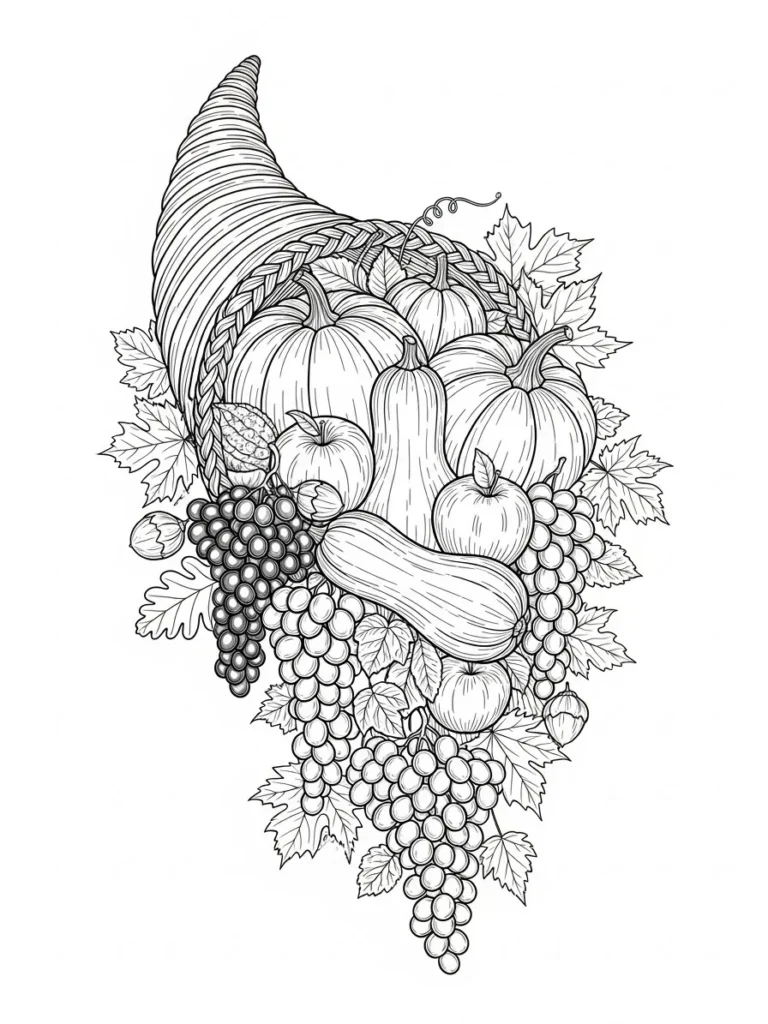 This coloring page perfectly showcases the classic symbol of plenty the magnificent cornucopia spilling over with autumn goodness. The design is focused on a large, spiraled horn of plenty, intricately lined to suggest a woven texture, which forms the top and structural element of the arrangement. Bursting out from its opening are masses of delicious harvest items including several pumpkins, long squash, apples, ears of corn, and the most glorious cascading bunches of grapes. All of this bounty is surrounded by large, detailed maple leaves, emphasizing the Thanksgiving or general fall harvest theme. The line work is beautifully executed, with lots of fine detail given to the grapes and the woven texture of the horn.