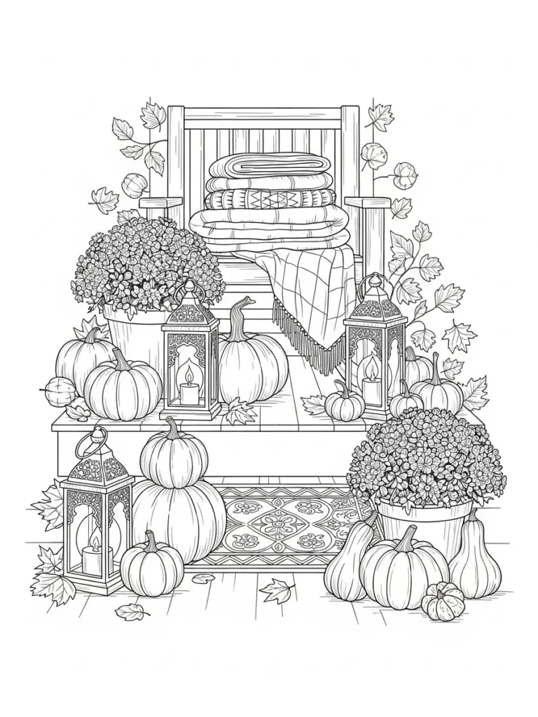 This coloring page is all about creating that perfect, welcoming autumn display right on your front porch or steps. The scene is dominated by a rustic wooden bench or chair stacked high with neatly folded blankets, one of which is draped over the side with a lovely plaid pattern and fringe. Flanking this cozy centerpiece are numerous pumpkins and gourds of every shape, creating a rich harvest feel on both the upper step and the floor below. Adding layers of warmth are two beautifully detailed lanterns, each containing a softly glowing candle flame, and two large pots overflowing with densely packed flowers, possibly mums or hydrangeas. Scattered maple leaves complete the festive look. The line work is clean and offers a delightful mix of textures to color, from the striped mug to the ornate lantern details.