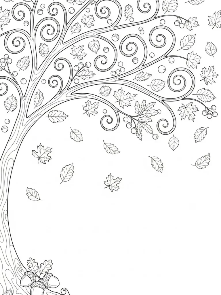 I find this design so relaxing because the swirling patterns are fantastic for just letting your hand flow freely across the page without needing strict precision, which is a wonderful change of pace. I can’t wait to use bright, glowing colors for the leaves and berries to make them pop against the more neutral tones I plan for the trunk and the swirls. Perhaps I’ll use a deep burgundy for the main branches and then choose contrasting golds and browns for the leaves and acorns. Coloring all those individual berries and the swirls will be so engaging and meditative. It truly feels like coloring a piece of beautiful, intricate autumn art designed just for me to unwind with.