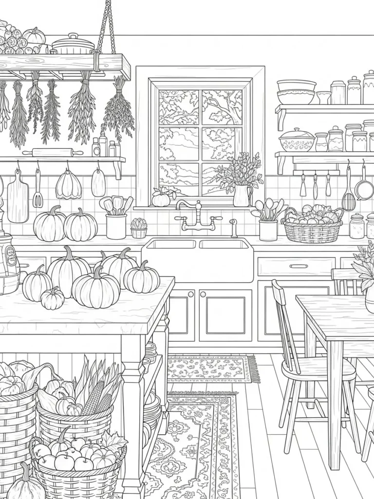 I think this page is incredibly fun because it offers such a variety of distinct objects to color, making it feel like a complete, lived-in scene. It’s engaging because I can spend time coloring the different patterns on the rugs, the textures of the wicker baskets, and the distinct grooves on every single pumpkin. I envision using deep, comforting browns and wood tones for the cabinets and floor, then making the harvest items glow with sunny yellows, deep reds, and rich greens for the vegetables. Coloring this scene feels like preparing for a big, happy fall feast, and it’s wonderfully relaxing to work on all the different areas methodically.