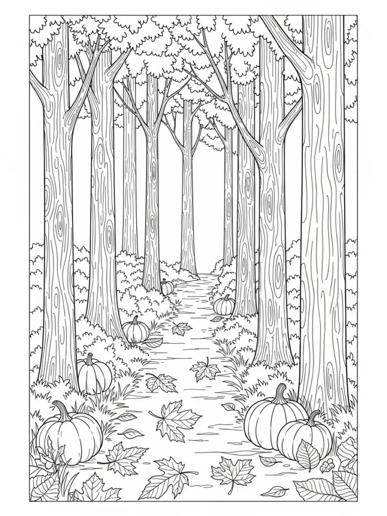 This coloring page transports us right into the woods during peak autumn foliage, giving us a wonderful sense of depth and atmosphere. The composition is strong, utilizing tall, textured tree trunks to frame a winding path that leads the eye toward the distant, softly rolling hills. The path itself is lined on both sides by grassy, bushy undergrowth and several lovely pumpkins resting on the ground among fallen leaves. The trees overhead have branches with detailed foliage creating a canopy that hints at the change of season. The line work is clean, with excellent texture lines defining the bark of the trees and the segments of the gourds.
