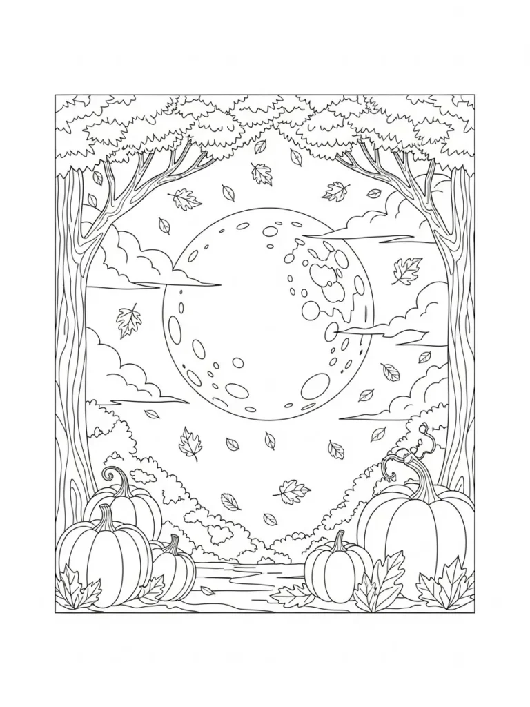 This captivating scene frames a magical autumn night under a giant, detailed full moon. The outer edges are bordered by the textured trunks of two framing trees whose leafy canopies suggest a natural arch overhead. Floating through the dark sky, which is dotted with fluffy clouds, are numerous falling maple leaves adding movement to the composition. At the bottom of the image, resting on what looks like a path or stream bed, is a charming group of pumpkins of various sizes, surrounded by fallen leaves. The line thickness is consistent and clear, making every element, especially the craters and markings on the moon, easy to define and color.