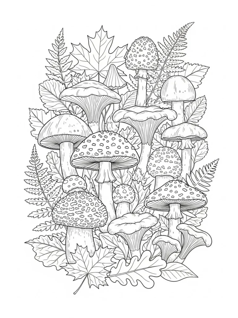 This coloring page brings you deep into a whimsical woodland setting filled with glorious fungi and foliage, perfect for embracing that earthy fall magic. The design is packed tight with a delightful variety of mushrooms, some sporting classic toadstool spots and others showing off the delicate gills underneath their caps. They are richly interspersed with the feathery texture of ferns and the distinct lobed shapes of maple and oak leaves scattered all around. The overall layout is vertically oriented and completely fills the frame, creating a dense, almost tapestry-like effect. The line work is detailed yet clean, especially on the spotted caps and the intricate fern fronds, inviting careful attention.