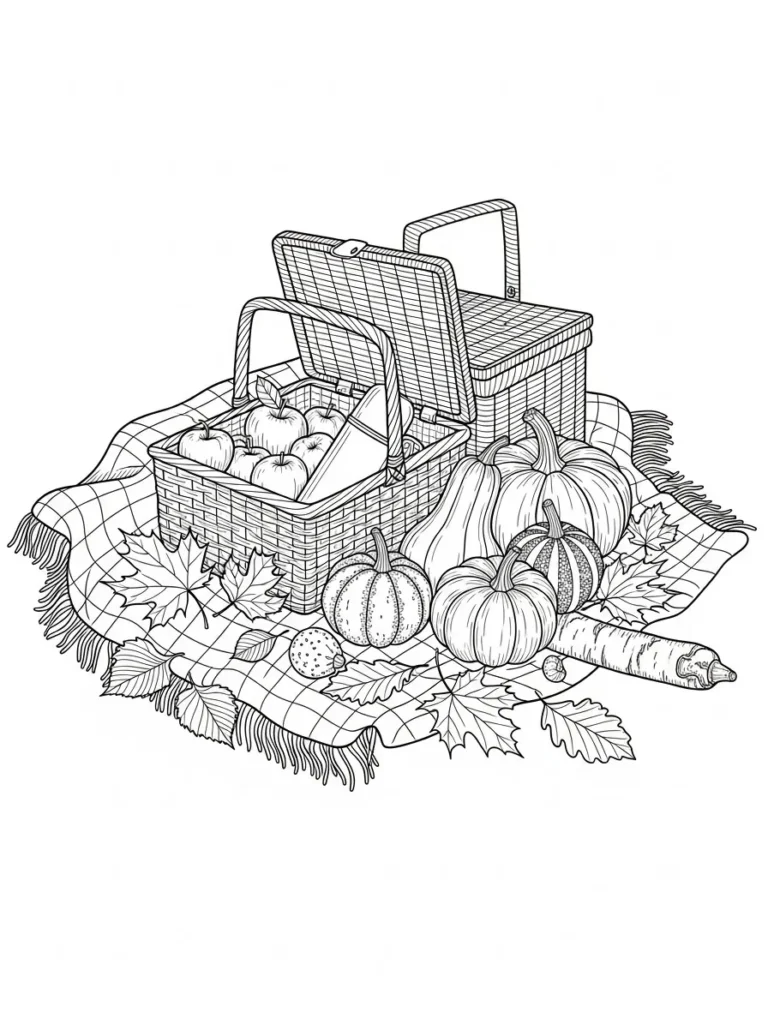 This lovely coloring page perfectly captures the essence of a crisp autumn afternoon spent outdoors enjoying the harvest bounty. The main focus is a traditional wicker picnic basket with its lid open, revealing a lovely stash of apples and perhaps a bottle or two tucked inside. The basket sits atop a wonderfully textured, fringed plaid blanket that sprawls across the bottom half of the page, giving a great background pattern to color. Surrounding the basket and spilling onto the blanket are several perfect pumpkins and gourds of different shapes, a long vegetable that looks like a carrot or squash, and scattered oak and maple leaves, making the whole scene look abundantly rich. The line work is clear, with the cross-hatching detail on the basket weave and the blanket plaid offering such fun contrast.