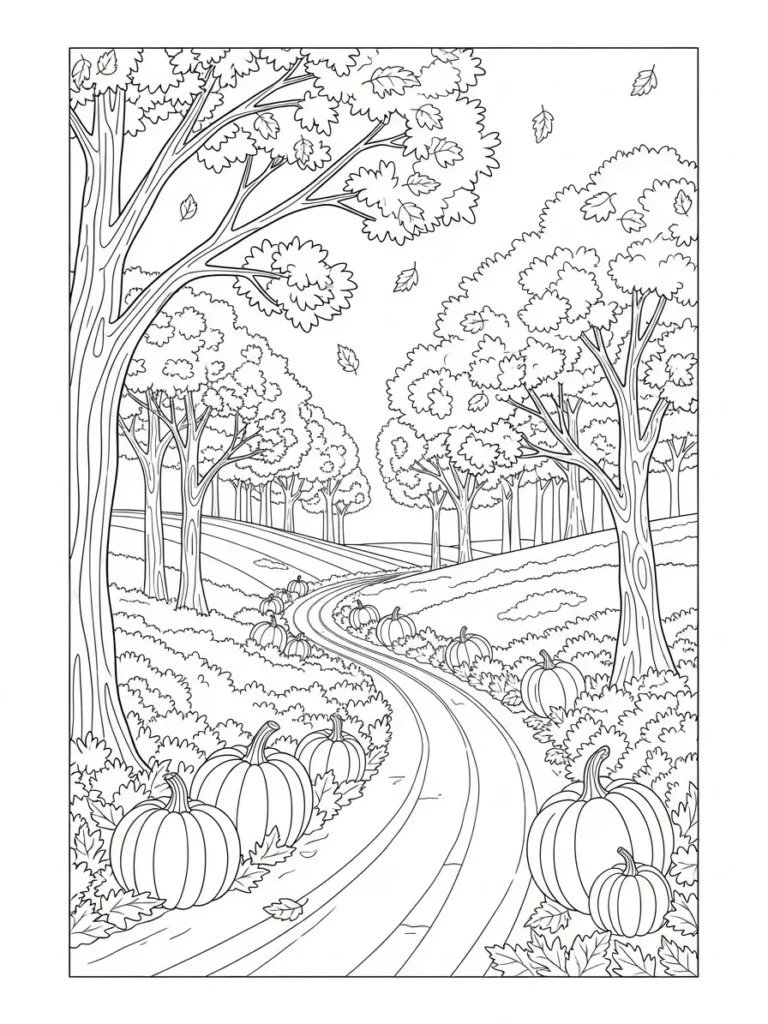 I find this design so engaging because the perspective of that winding road just pulls you right into the scene, making you want to color every section beautifully. I think this is super relaxing because you get to work on large areas like the road and the distant hills, letting you use big, sweeping strokes with your pencils or markers, which is always a nice break. Then you can slow down to focus on the detailed textures of the closest pumpkins and the different leaf shapes scattered near your feet. I’m imagining rich, earthy path colors contrasted with bright, sunny yellows and oranges for the pumpkins, creating that perfect cozy autumn journey vibe.