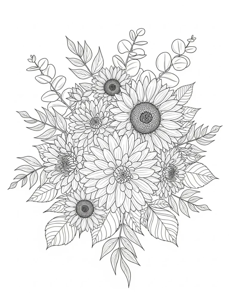 This gorgeous design is a stunning, centrally focused floral arrangement perfect for celebrating late summer transitioning into fall. It features a lush bouquet dominated by large sunflowers with heavily textured centers and several layered, intricate dahlias packed in close. Accompanying the blooms are sprays of delicate eucalyptus leaves and other elongated foliage, providing graceful lines that contrast beautifully with the rounded flower heads. The overall layout is a classic, dense cluster that radiates outward from the center, filling the page with organic shapes. The line work is wonderfully detailed, especially in the centers of the sunflowers and the fine parallel lines used to shade the leaves, giving you tons of dimension to work with.