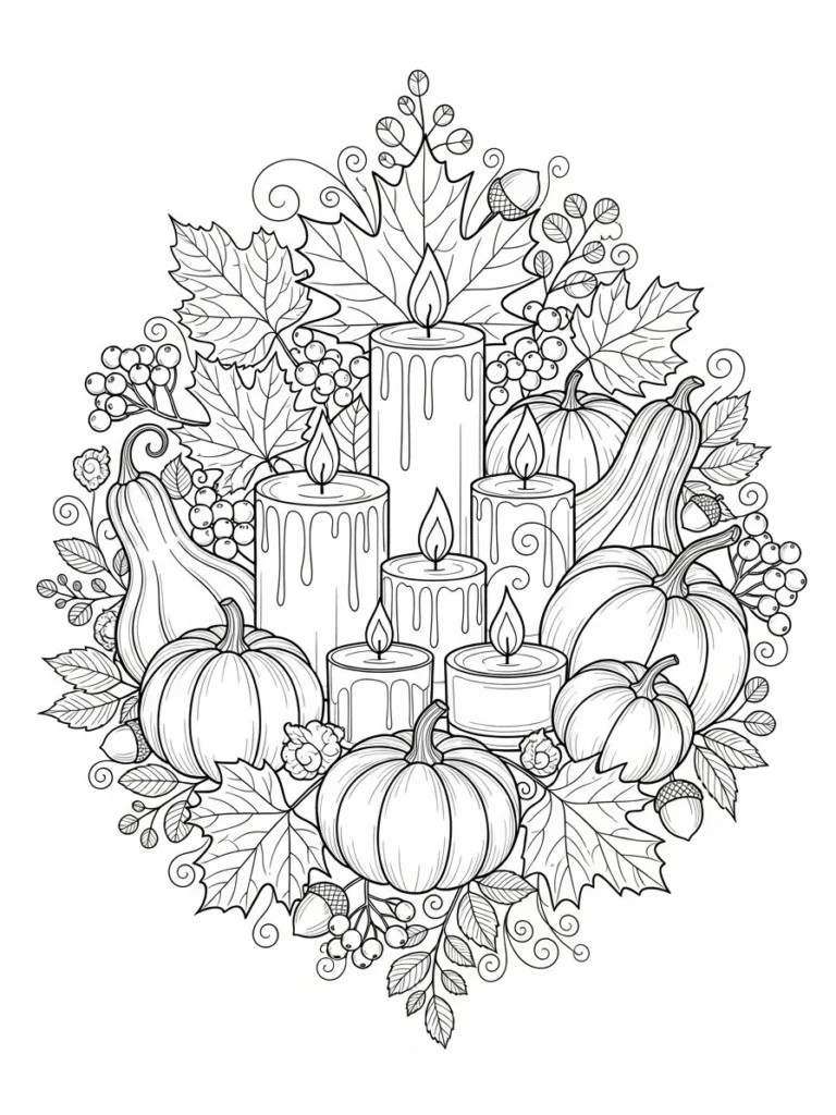 This coloring page presents a beautiful, symmetrical arrangement that feels like a lovely little seasonal wreath or mandala centered around candlelight. The motifs are clearly autumn focused with various pumpkins and gourds, including both round and elongated squash shapes, nested among detailed maple leaves, smaller oak leaves, delicate berry clusters, and a couple of acorns. At the heart of the arrangement are five lit candles of different heights, their wax drips adding a nice organic pattern, contrasting with the strong veins in the surrounding leaves. The overall layout is tightly packed and circular, flowing outward from the center with graceful swirls in the foliage providing an elegant frame. The line quality is very sharp, making all the tiny berry dots and leaf veins easy to delineate.