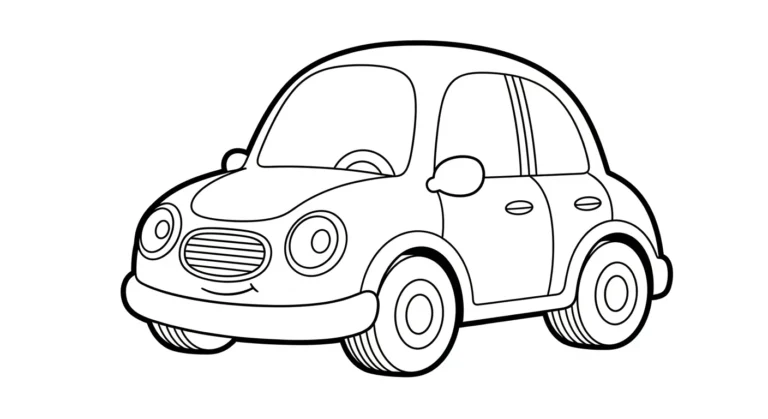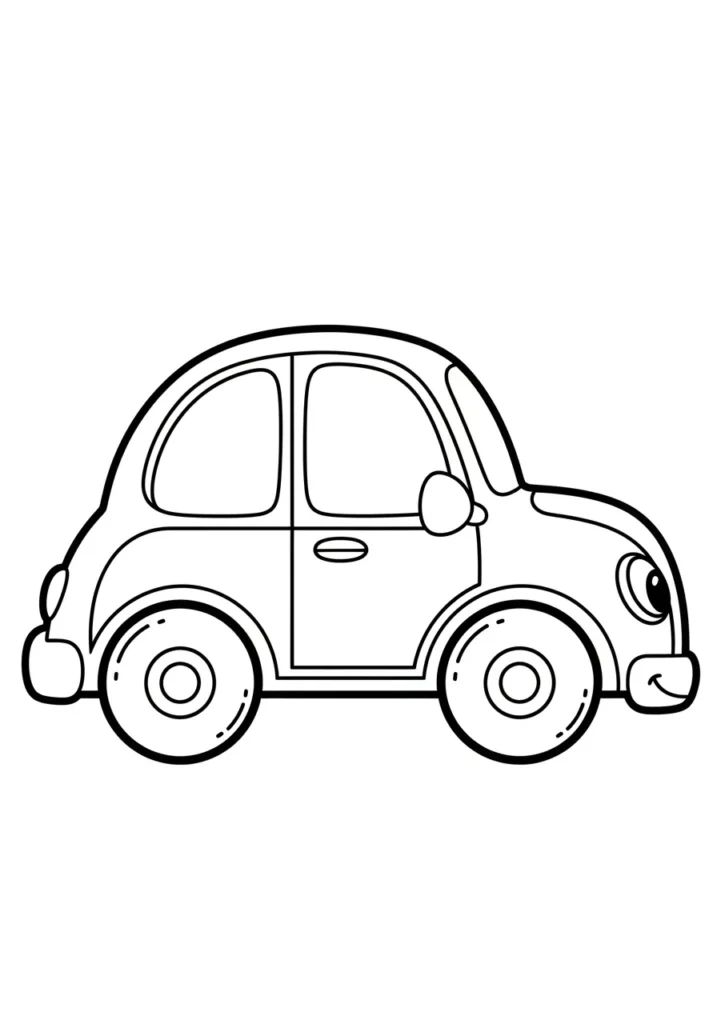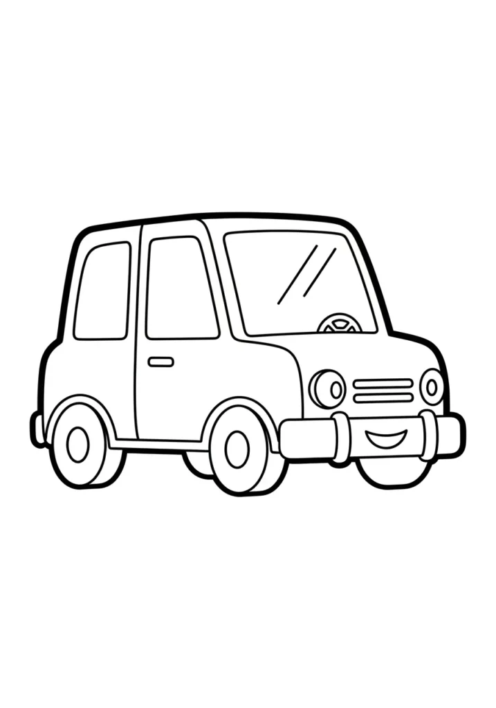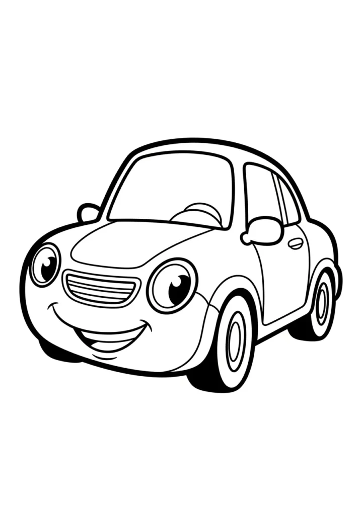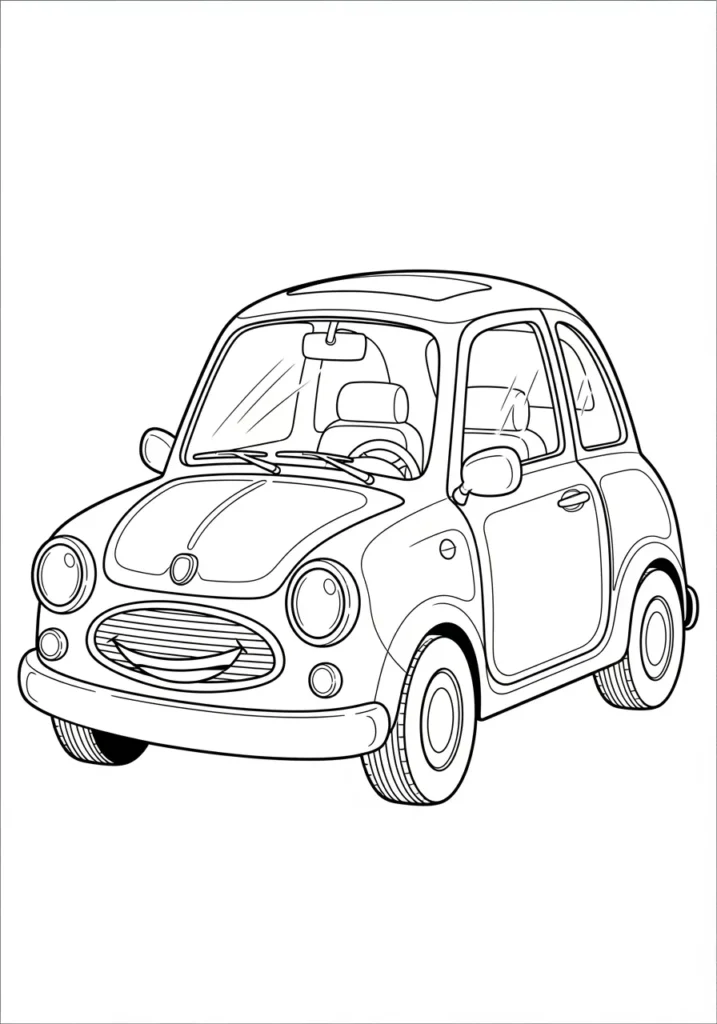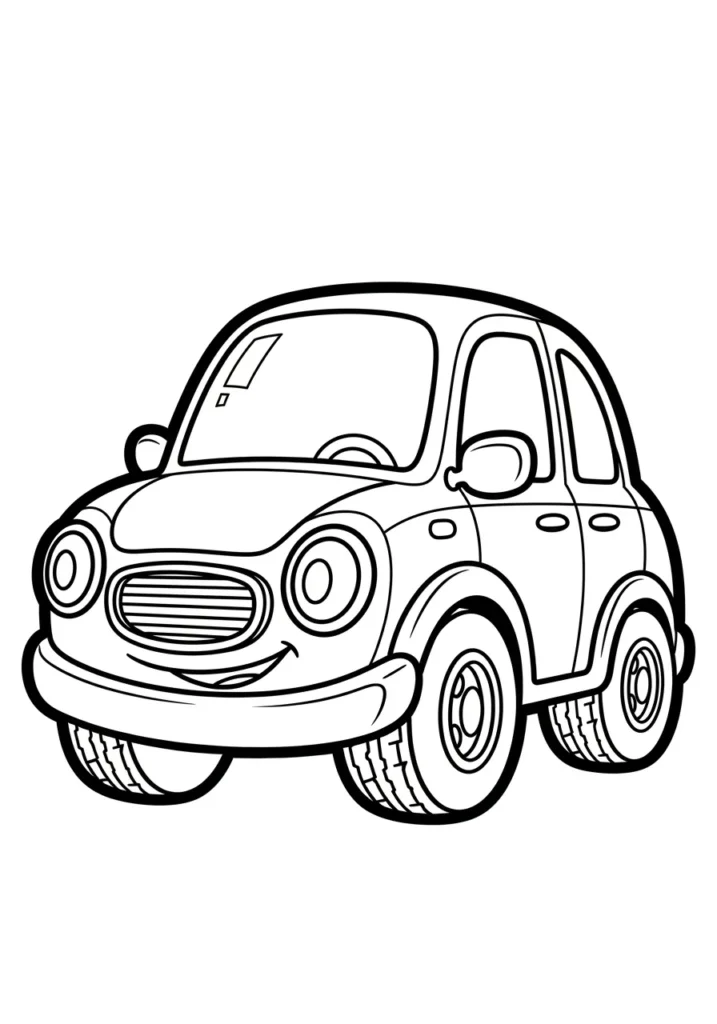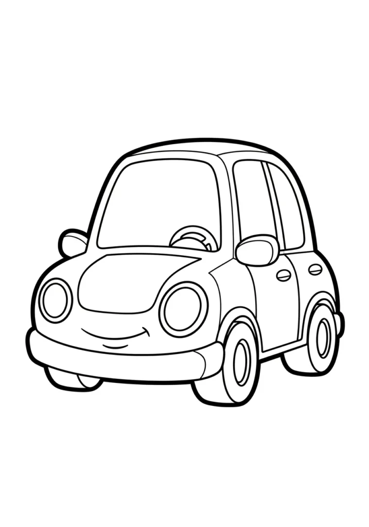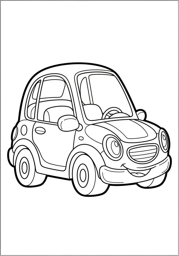 This coloring page features a compact car with a cheerful smile and big rounded headlights that give it lots of personality. The body is made up of smooth curves and bold outlines, with simple details on the wheels and windows. Everything is nicely spaced, making the design feel friendly and easy to color.