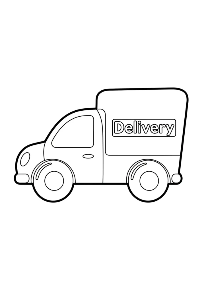 This coloring page shows a small delivery truck with a rounded cabin and a simple boxy back. The shapes are bold and clear, and the lettering on the truck adds a little interest without making the page busy. The design stays clean and very approachable for beginners.