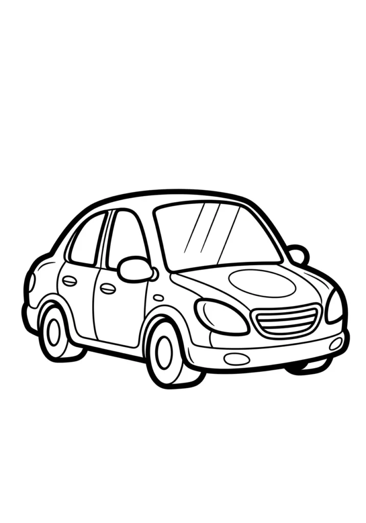 This coloring page shows a rounded sedan style car with gentle curves and a slightly angled front view. The lines are clean and consistent, with just enough detail to give the car shape without making it complicated. The overall design feels balanced and very approachable.