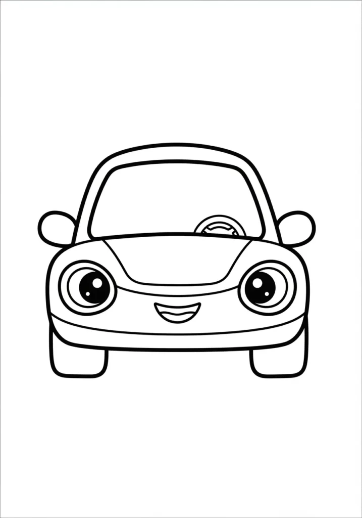 This coloring page shows a front facing car with a happy face and big round headlights that feel very friendly and playful. The lines are bold and smooth with simple shapes throughout, making the windshield, bumper, and tires easy to recognize and color. There are no tiny details or busy patterns, just clean outlines and lots of open space that keep the whole design calm and beginner friendly.