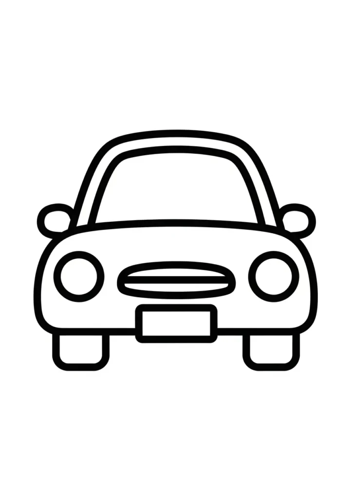 This design features a straightforward front view of a small compact car with evenly shaped headlights and a clean body outline. The lines are thick and consistent, and the layout stays very balanced, which makes it super approachable for beginners. Everything is clearly separated, from the wheels to the hood, with plenty of white space that keeps it uncluttered and easy to follow.