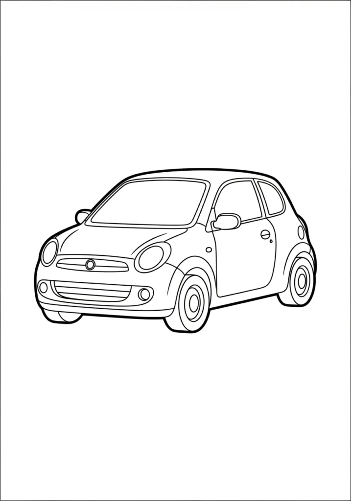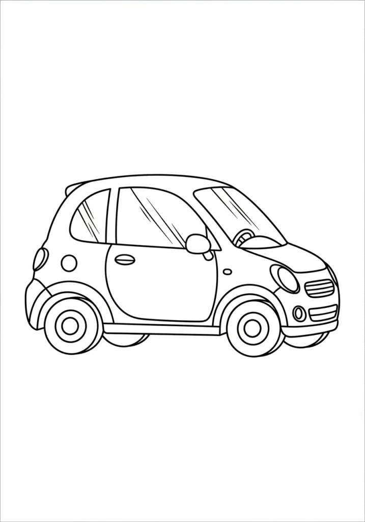 This design features a small rounded hatchback with soft curves and a smooth outline. The windows, doors, and tires are drawn with clean lines and minimal detail, keeping the page easy to color. The overall layout feels cozy and simple, perfect for beginner level coloring.