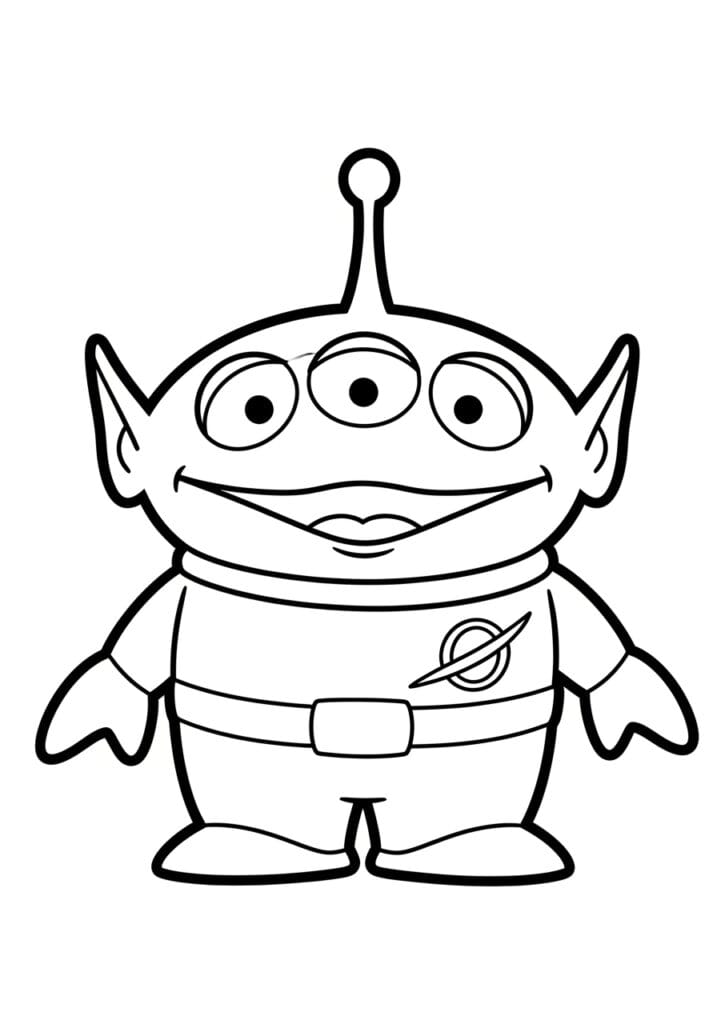This coloring page features the instantly recognizable Little Green Man from Toy Story, standing front and center with his three wide eyes, pointed ears, single antenna, and that perpetually amazed little smile. His rounded body is divided into sections by a couple of horizontal lines that suggest his space suit, and a small planet logo on his chest adds a cute extra detail right in the middle of the design. The outlines are thick and bold throughout, giving the whole illustration a satisfying chunkiness that makes it really easy to color neatly. The symmetrical, centered composition is clean and unfussy, which makes this page feel really approachable and beginner-friendly.