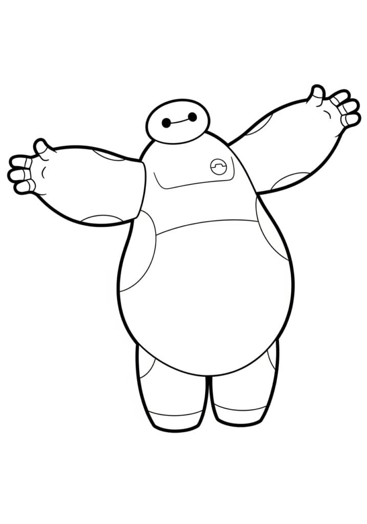This coloring page features the wonderfully squishy healthcare companion Baymax from Big Hero 6, standing with both arms stretched wide open in what can only be described as the universal pose for “I am going to give you the best hug of your life.” His body is made up of beautifully simple rounded shapes, with gentle curved lines dividing his arms, legs, and torso into soft inflatable-looking sections that give him that signature marshmallow robot quality. A small circular button detail sits on his chest, and his tiny oval eyes on that little head perched right on top of his giant body are just the most perfectly minimalist face you’ve ever seen on a character. The outlines are bold and confident throughout, keeping the whole design clean, modern, and really satisfying to look at even before you add any color.
