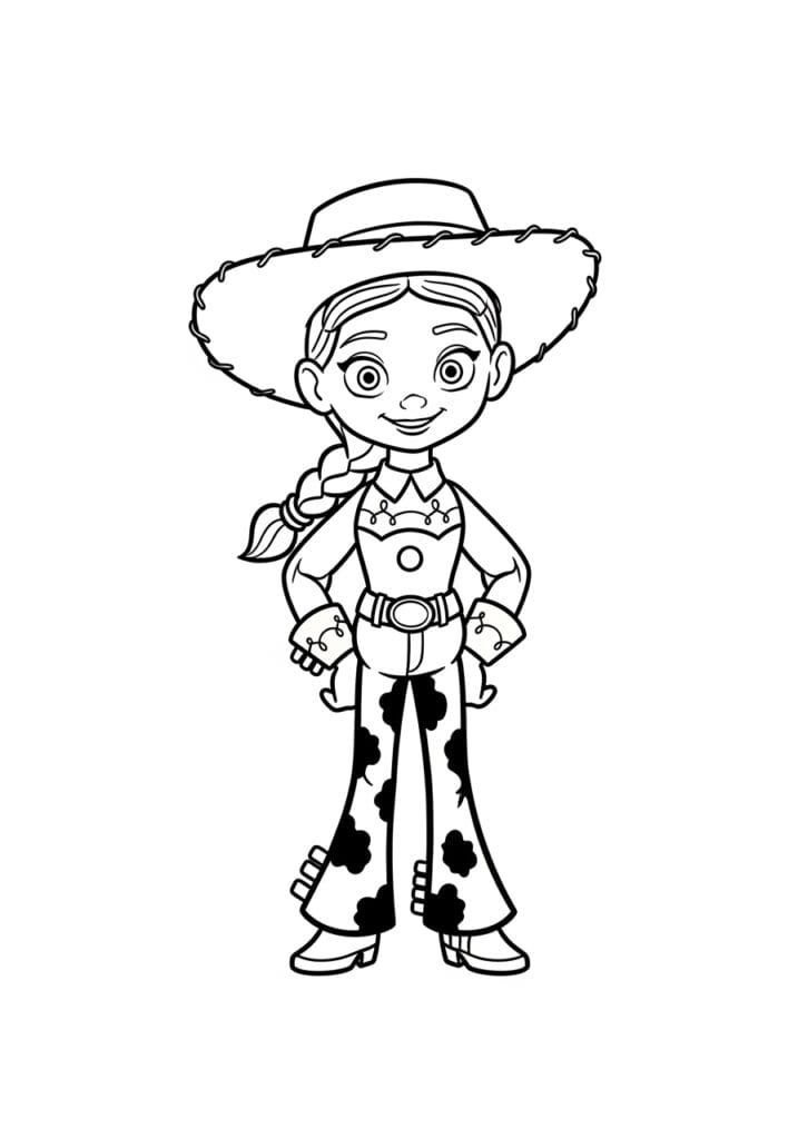 This coloring page shows Jessie from Toy Story in her full cowgirl glory, standing with her hands on her hips and that bright-eyed, adventurous smile that makes her one of the most beloved characters in the whole Pixar universe. Her oversized wide-brimmed hat dominates the top of the page beautifully, with a lovely stitched border detail running all the way around the brim that adds a charming rustic touch. Her outfit is packed with great details to work through, from the decorative embroidery on her vest and cuffs to the bold cow-print patches scattered across her flared trousers, and her long side braid with a little ribbon tie completes the look perfectly. The lines are clean and confident throughout, with a nice mix of bold outlines and finer interior details that make the page feel visually rich without being overwhelming.