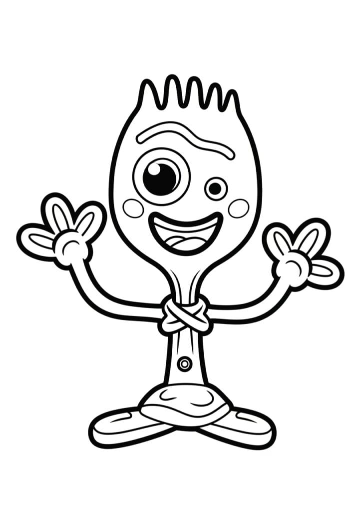 This coloring page features Forky from Toy Story 4 in all his gloriously weird homemade glory, standing with both bendy pipe cleaner arms raised up in the air and that massive lopsided grin spread across his spoon-shaped face. His design is delightfully quirky and unlike anything else in the Disney coloring page world, with a forked top where his tines stick up like a little crown, googly mismatched eyes of two very different sizes, and popsicle stick feet crossed at the bottom that give him the most charmingly wonky stance. A piece of string or rubber band is wrapped around his middle section, and the whole illustration uses bold confident outlines that make his unusual shape really pop on the page. The overall layout is centered and full of personality, and honestly just looking at this design before you even pick up a pencil is enough to make you smile.
