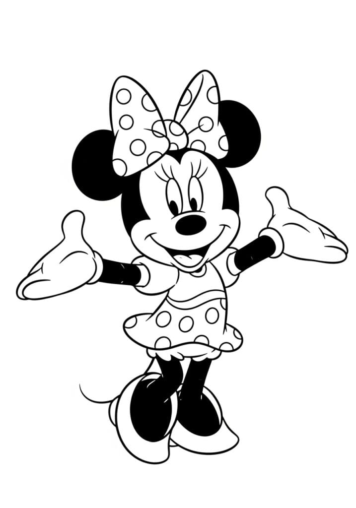 This coloring page shows Minnie Mouse in the most adorable open-armed pose, looking like she’s about to give everyone a big hug. The design is full of her signature polka dot pattern, which appears both on her oversized bow and her cute little dress, giving you loads of small circular shapes to color in. The outlines are bold and confident throughout, with slightly thinner lines used for the delicate details like her eyelashes and the ruffled hem of her dress. The whole composition feels lively and energetic, with her arms spread wide and her little heels lifted off the ground, making the page feel full of movement even in black and white.