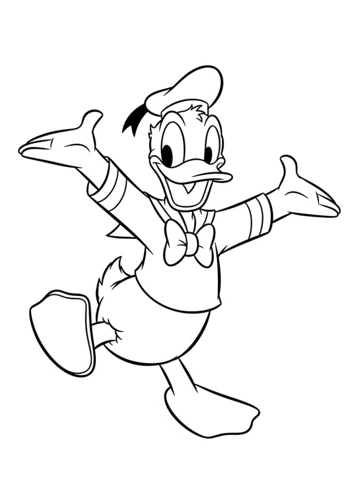 This coloring page captures Donald Duck mid-leap with his arms flung wide open and one foot kicked up behind him, which makes the whole design feel wonderfully spontaneous and fun. His classic sailor outfit is all here, complete with the little striped cuffs on his sleeves, his iconic navy cap, and that cute little bow tie sitting right at his collar. The outlines are nice and bold throughout, with just enough fine line detail in his feathery tail and facial expression to keep things interesting. The layout uses the full page really well, with Donald’s outstretched arms giving the composition a wide, open feel that practically jumps off the paper.