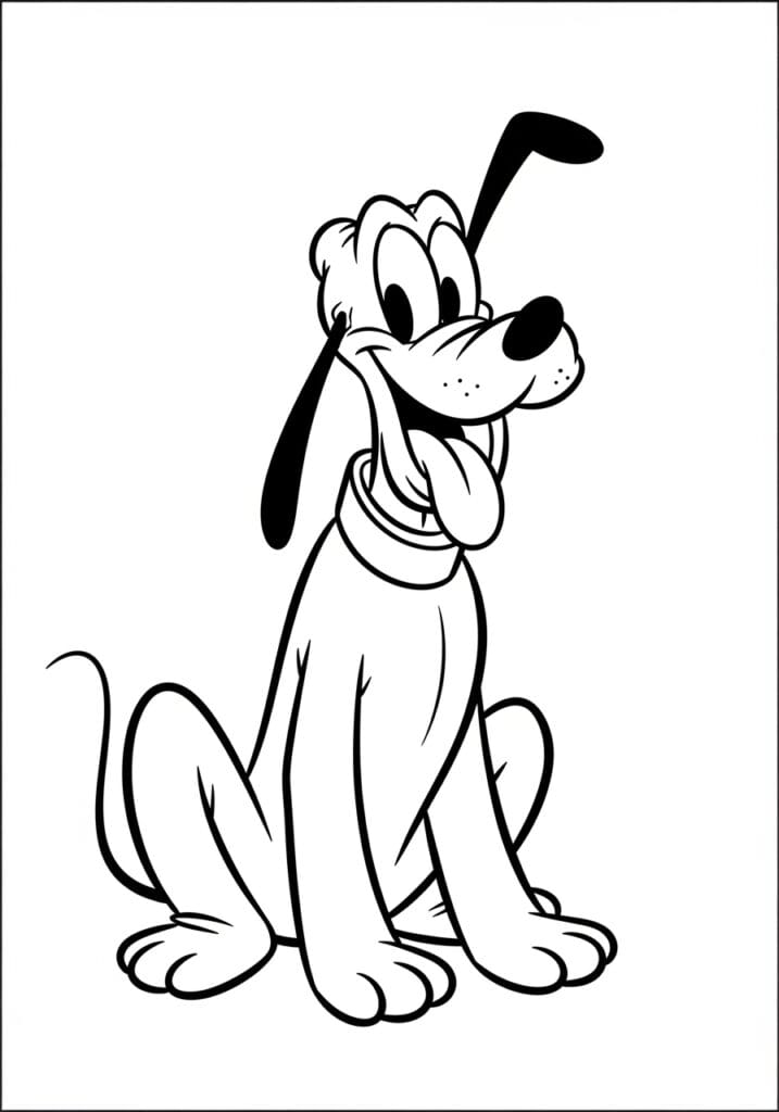 This coloring page features Mickey’s beloved pup Pluto in the most adorable seated pose, tongue lolling happily to one side and those big expressive eyes looking straight at you like he wants a treat right now. The illustration uses lovely smooth, flowing lines that follow the natural curves of his body really beautifully, capturing that classic rubbery cartoon anatomy that Pluto has always been known for. His long floppy ears, little collar, tiny freckle dots on his muzzle, and curled tail are all rendered with just the right amount of detail to make him instantly recognizable without being overwhelming to color. The composition is centered and well-proportioned on the page, filling the space in a way that feels calm and grounded rather than chaotic.